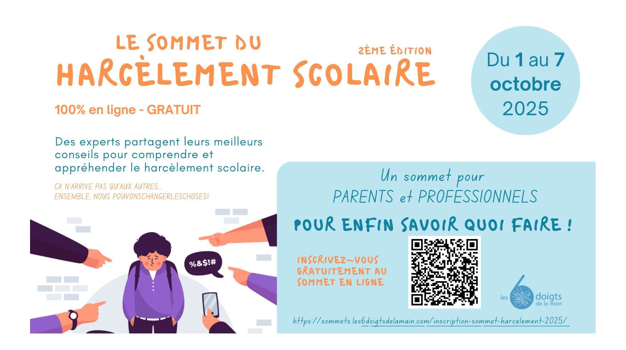 Après le succès de la première édition qui avait rassemblé plus de 8 000 participants, le 2ème Sommet en ligne contre le harcèlement scolaire se tiendra du 1er au 7 octobre 2025. Cet événement 100% en ligne et entièrement gratuit s’adresse aux familles, enseignants, associations et professionnels de l’éducation et de la santé.