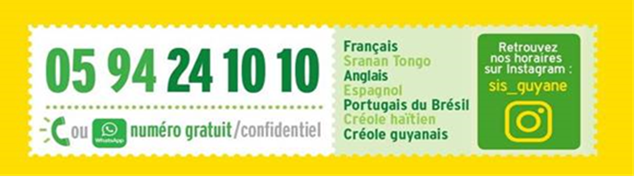En Guyane, SIS Association assure les permanences téléphoniques gratuites, accessibles chaque lundi, mardi et vendredi de 9h à 15h et chaque mercredi de 12h à 18h, vendredi et samedi de 17h à 23h par téléphone ou via Whatsapp au 05 94 24 10 10. Les écoutant.es parlent différentes langues et pourront ainsi dialoguer aux mieux avec les appelant.es : Français, Sranan Tongo, Anglais, Créole guyanais, Créole Haïtien, Portugais et Espagnol.