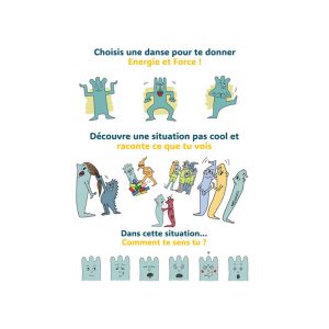 Il ouvre la porte à l’expression orale, à la formulation des émotions et aux différentes manières de prendre confiance en soi en exprimant ses sentiments face à 30 situations problématiques.
